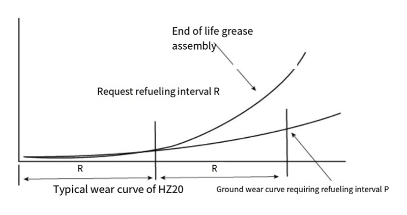 Le matériau HZ20 suit une règle d'usure spéciale, comme indiqué sur la figure 4, une abrasion infinitésimale peut se produire en phase R lorsqu'il est appliqué avec de la graisse puis installé. Mais après la phase R. la condition limite de lubrification disparaîtra et l’usure sera exagérée. Si vous faites le plein d'huile. le produit peut être considérablement maintenu par un port non remarquable et sa durée de vie sera également considérablement prolongée. Par conséquent, l'avantage du matériau HZ20 est que l'huile doit être ajoutée avec un